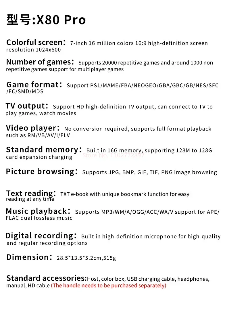 Product list:host,color box,USB charging cable, headphones, instructions, HD cable(The handle needs to be purchased separately)